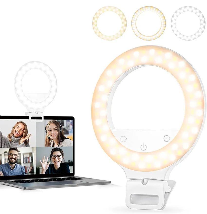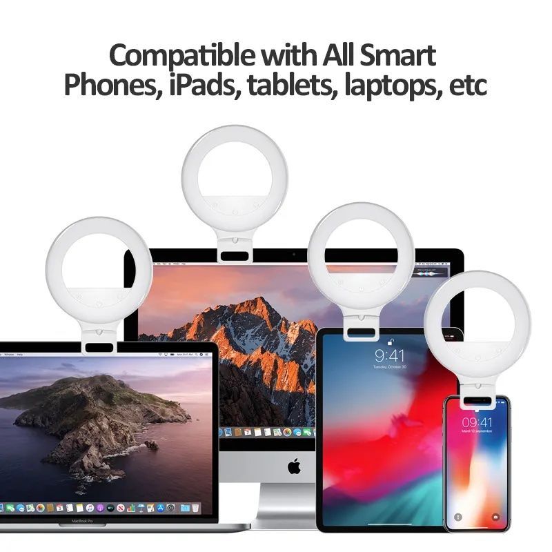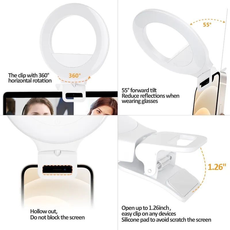 La clip per selfie con luce anulare è la soluzione perfetta per scattare foto ben esposte. Collega la clip al tuo telefono oppure al tuo pc o al tuo laptop per creare un'atmosfera meravigliosa per il tuo selfie, chat video, video TikTok, ecc. Hai 3 opzioni di colore freddo/caldo/naturale, per le tue diverse esigenze di selfie. A differenza di altre luci del telefono, la luce ad anello per selfie ha un'ampia gamma di attenuazione. Che tu ne abbia bisogno extra luminoso o debolmente luminoso, tieni semplicemente premuto il pulsante per ottenere il livello di luminosità desiderato. Puoi caricare il selfie ring con un caricatore da muro 5V1A, un power bank, una presa USB per laptop, con il cavo USB incluso.